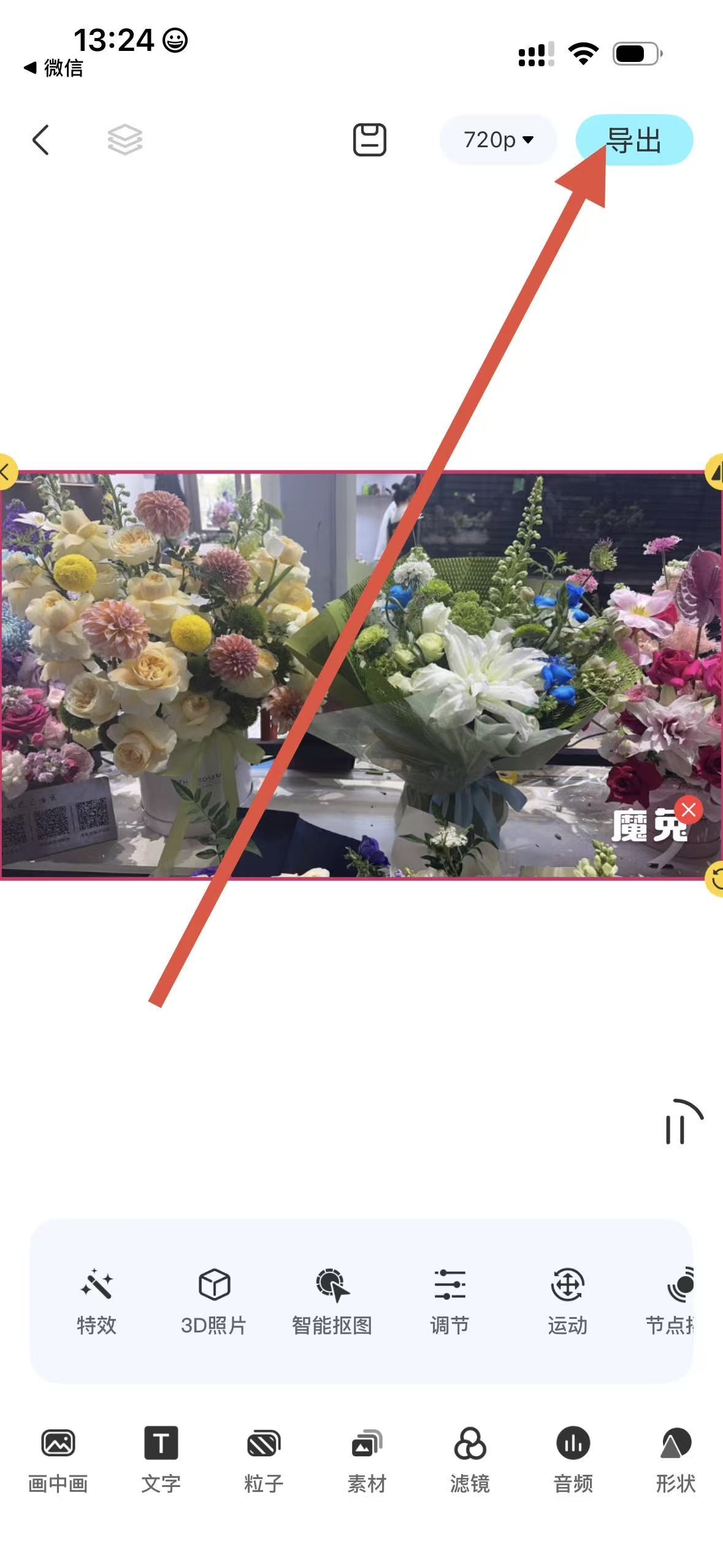 4、在編輯頁面,可利用特效、文字等功能進(jìn)行創(chuàng)作,創(chuàng)作完成后點(diǎn)擊導(dǎo)出,保存創(chuàng)作成果。