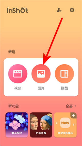 1、打開(kāi)InShot軟件,點(diǎn)擊圖片選項(xiàng)進(jìn)入圖片選擇界面。
