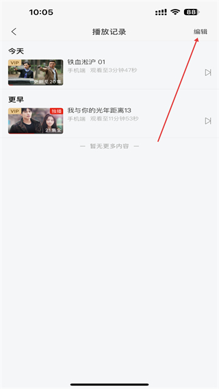 3、進入播放記錄的頁面內(nèi),點擊右上編輯的按鈕。