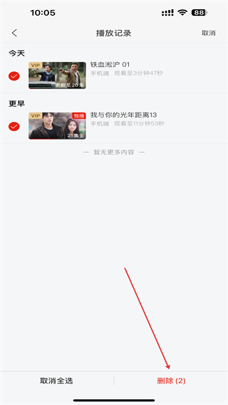 4、勾選播放的視頻后,點擊右下刪除的按鈕即可。