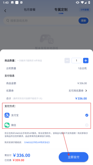 4、選好套餐后,確認商品數(shù)量、云機數(shù)量,選擇支付方式,點擊立即支付按鈕完成付款。