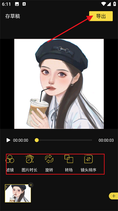 4、緊接著,能看到一些常見的工具,如濾鏡、轉場等等,都能使用,點擊右上方【導出】即可;
