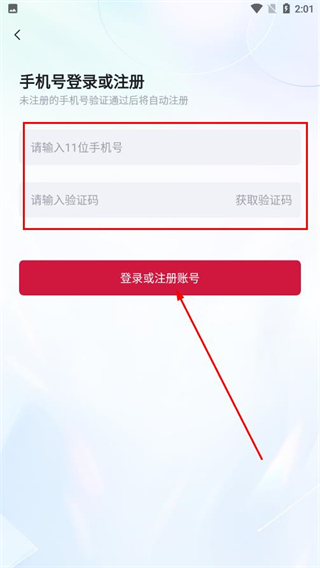 3、輸入手機(jī)號(hào),填入驗(yàn)證碼,點(diǎn)擊登錄或注冊(cè)賬號(hào),將自動(dòng)注冊(cè)。