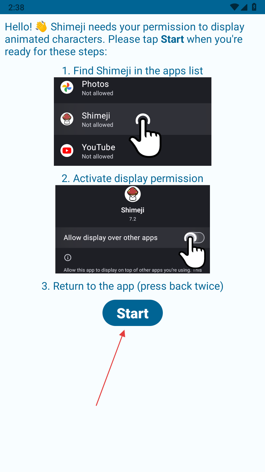 1、打開Shimeji應(yīng)用彈出權(quán)限請求界面,按提示在手機應(yīng)用列表找到Shimeji,點擊開啟權(quán)限按鈕。進入手機設(shè)置的顯示權(quán)限頁面。