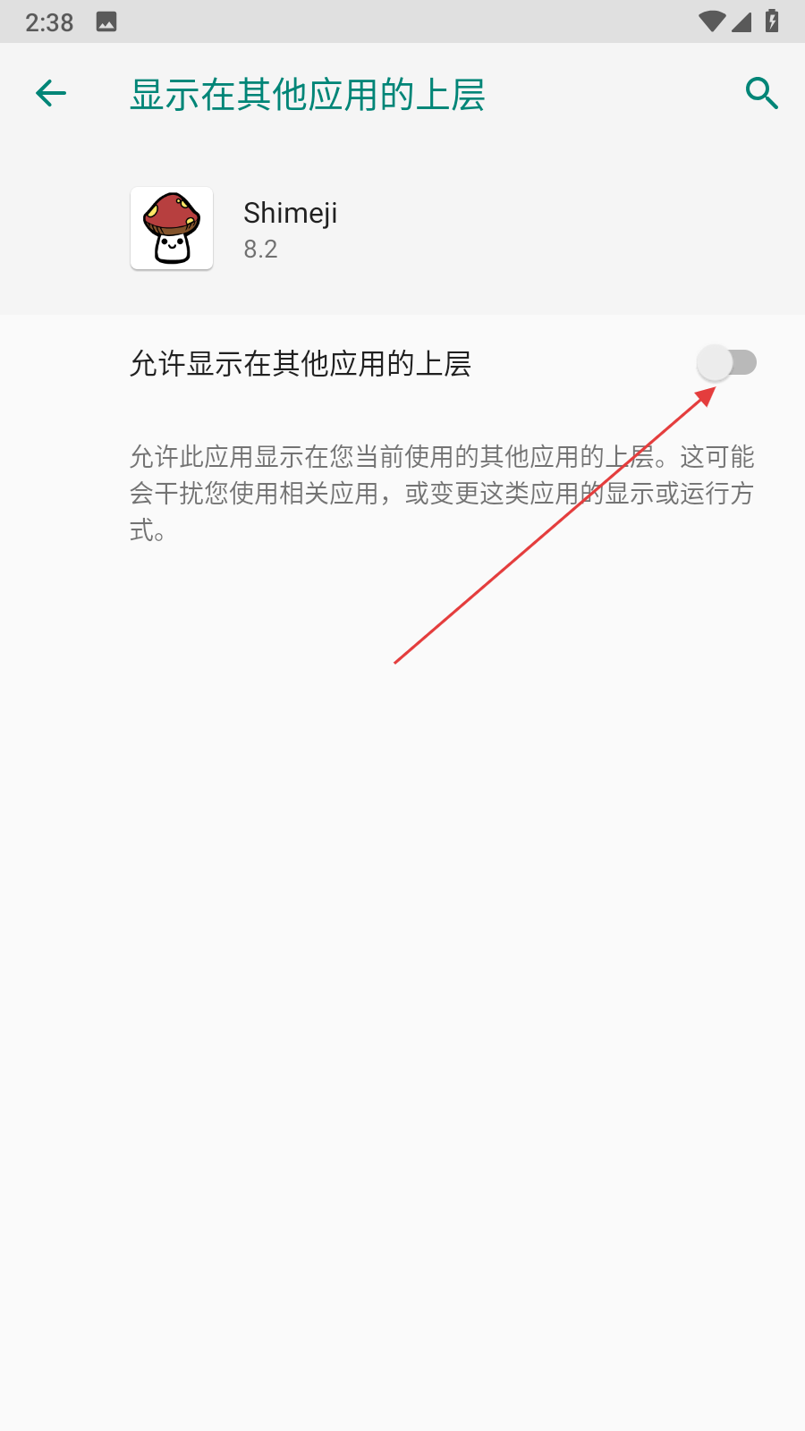 2、進入手機設(shè)置的顯示權(quán)限頁面,打開允許Shimeji顯示在其他應(yīng)用上層的開關(guān)。