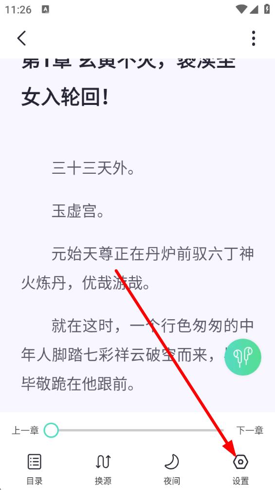 2、在小說(shuō)閱讀界面點(diǎn)擊屏幕,長(zhǎng)按屏幕顯示出現(xiàn)底部菜單欄后點(diǎn)擊右下角設(shè)置圖標(biāo)。
