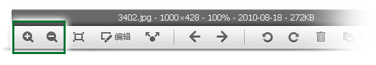 看圖窗口工具欄上的放大鏡的按鈕,就是縮放功能,點“+”放大圖片,點“-”縮小圖片。