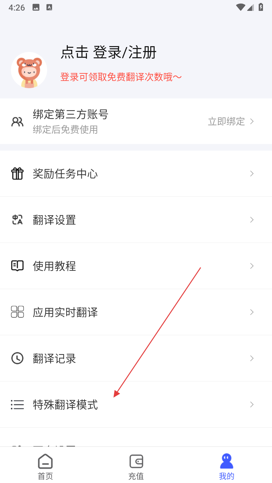 1、打開游戲翻譯助手應用,點擊底部導航欄中的我的選項進入個人中心頁面,在頁面中找到特殊翻譯模式選項并點擊。