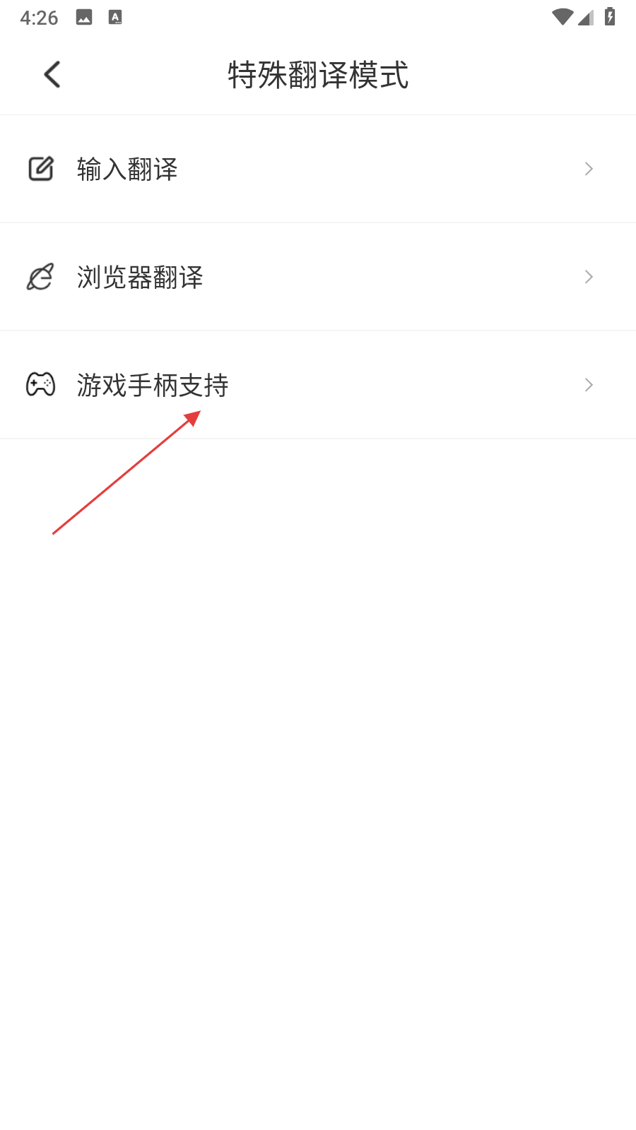 2、進入特殊翻譯模式界面后,找到游戲手柄支持選項,點擊進入游戲手柄支持設置頁面。