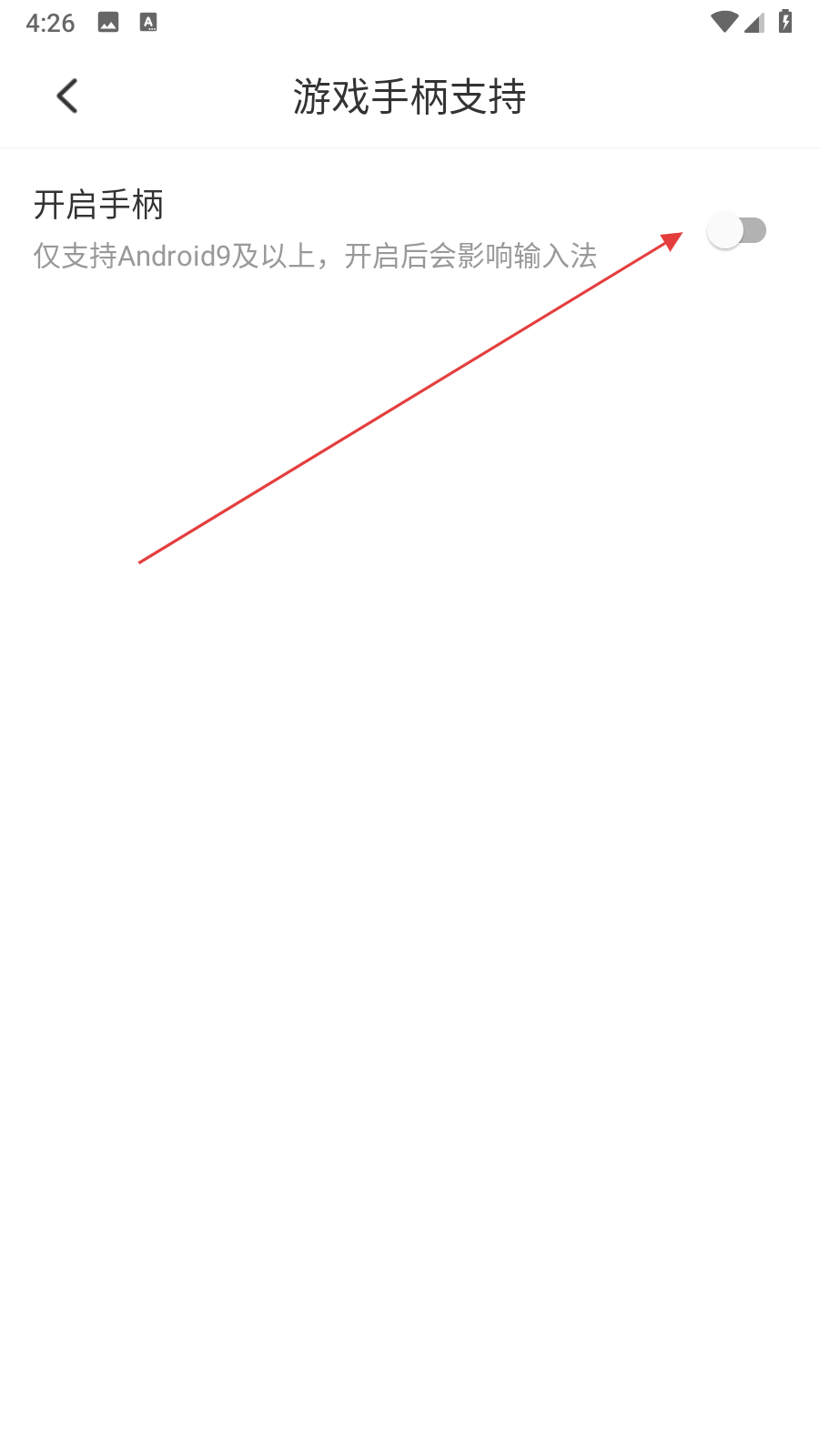 3、在游戲手柄支持頁面中,找到開啟手柄開關,點擊將其打開,需注意該功能僅支持Android 9及以上系統(tǒng),開啟后可能會影響輸入法。