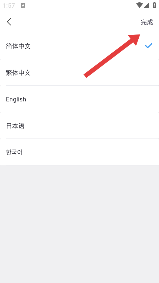 4、在語(yǔ)言選擇界面,點(diǎn)擊簡(jiǎn)體中文選項(xiàng),然后點(diǎn)擊完成按鈕,即可設(shè)置為中文模式。