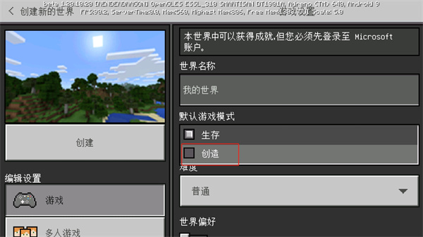 4、隨后在對(duì)世界的屬性設(shè)定上面,點(diǎn)擊【默認(rèn)游戲模式】去選擇【創(chuàng)造】就可以創(chuàng)建一個(gè)創(chuàng)造屬性的世界;