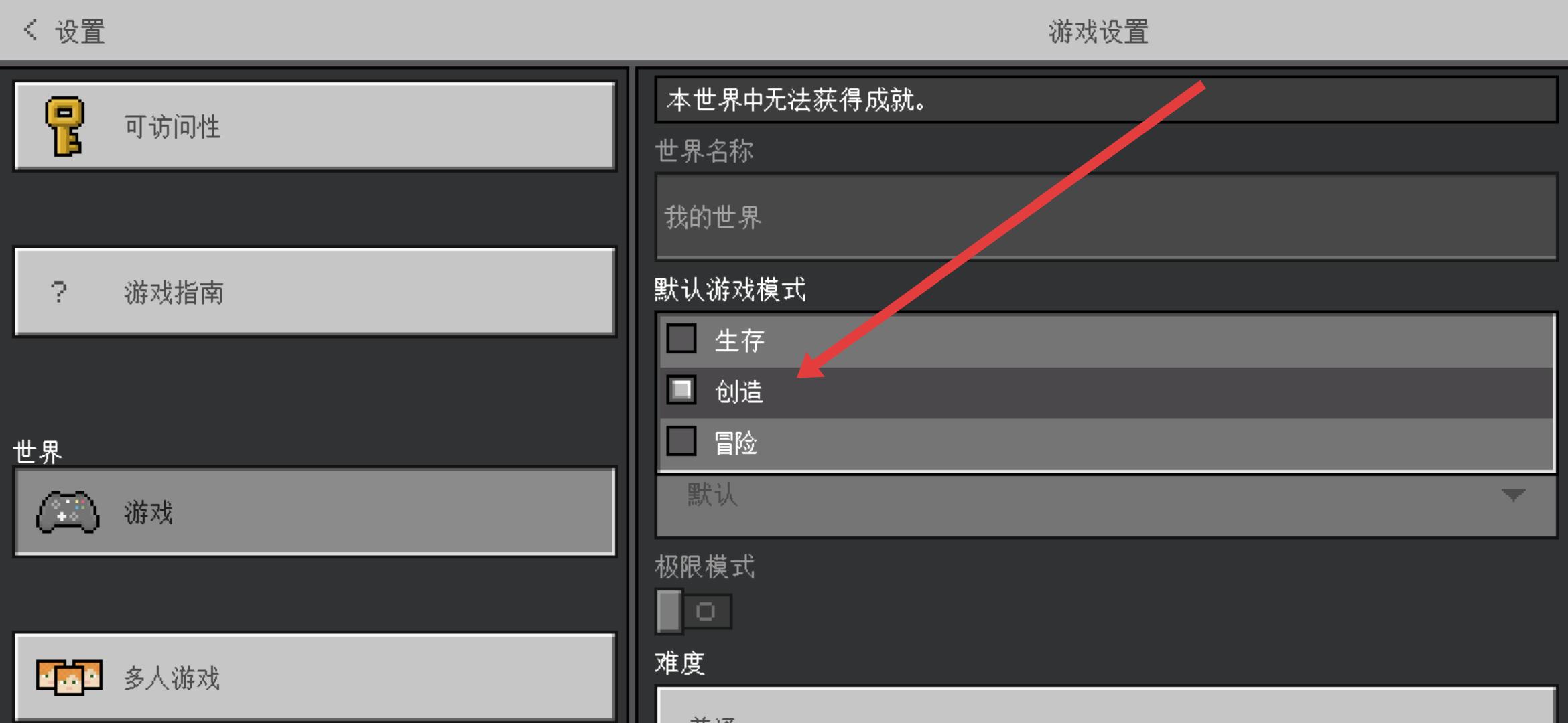 3、在設置的默認游戲模式欄中,勾選生存或冒險、極限模式,可以關閉創(chuàng)造的模式,切換至對應玩法。