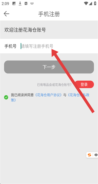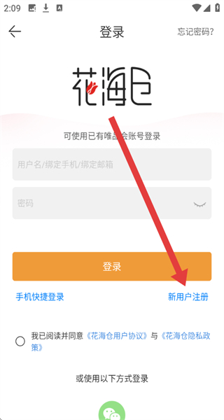 2、在花海倉APP登錄頁面點擊“新用戶注冊”,進入手機注冊界面。