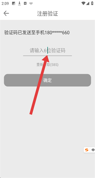 4、進入注冊驗證界面,輸入收到的6位驗證碼,完成賬號注冊操作。