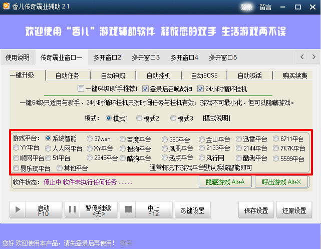 香兒傳奇霸業(yè)輔助是專為熱門網頁游戲《傳奇霸業(yè)》打造的輔助工具。軟件功能強大,可以快速幫助快速完成日常任務、活動、副本等。軟件的掛機功能異常強大,可以讓普通用戶與VIP掛機用戶一樣,在任意地點掛機!趕快下載體驗吧!
