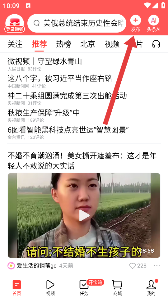 1、進入app首頁后,在頭條首頁的頂部,需要點擊紅色發(fā)布的按鈕,進入內(nèi)容創(chuàng)作的編輯界面。