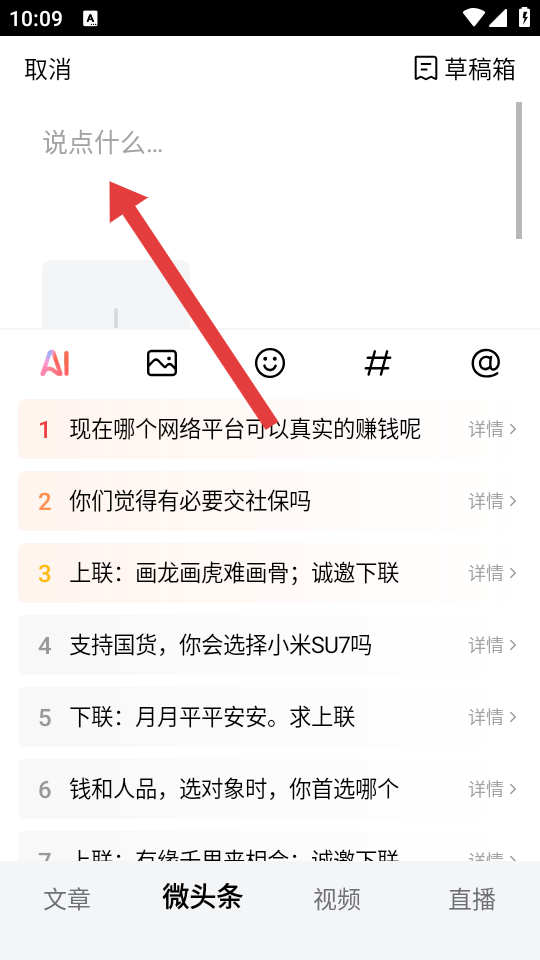 2、在發(fā)布界面的說點什么...輸入框中,填寫想要發(fā)布的內(nèi)容如觀點、動態(tài)等,啟動創(chuàng)作發(fā)布流程。