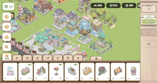 點擊“多選”按鈕,可以選中多個裝飾集體移動,甚至連地磚也可以一并轉(zhuǎn)移,非常適合范圍布局。旁邊的“消除”按鈕,可以將多個裝飾合并消除,一步到位的便利操作。