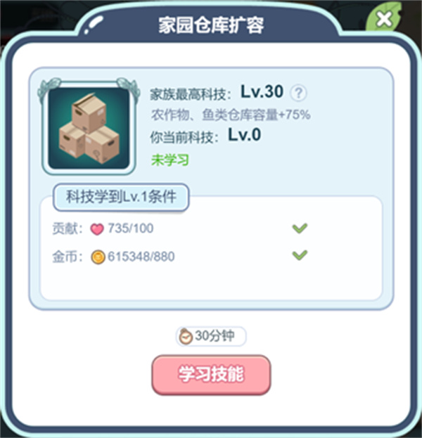 家族科技學(xué)習(xí)技能也可以擴(kuò)充倉(cāng)庫(kù)容量,但需要消耗家族貢獻(xiàn)與金幣。另外,擁有月卡可獲得50%的容量加成。