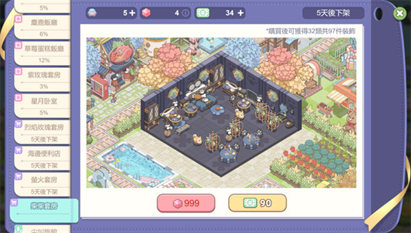 限量主題家具可以用粉鉆石兌換或綠鈔購(gòu)買,部分還可以用鉆石購(gòu)買獲得,粉鉆石可以通過(guò)家具貨車、上榜室內(nèi)布局大賽排行榜、集齊收集主題家具套裝中獲得,也能使用綠鈔購(gòu)買,無(wú)需等待就能直接獲得一整套裝飾。