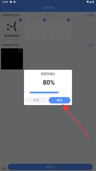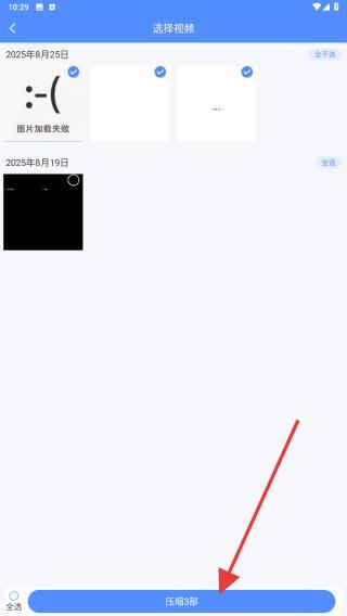 2、在選擇視頻界面中,勾選要壓縮的視頻,可多選,選好后點擊底部壓縮的按鈕。