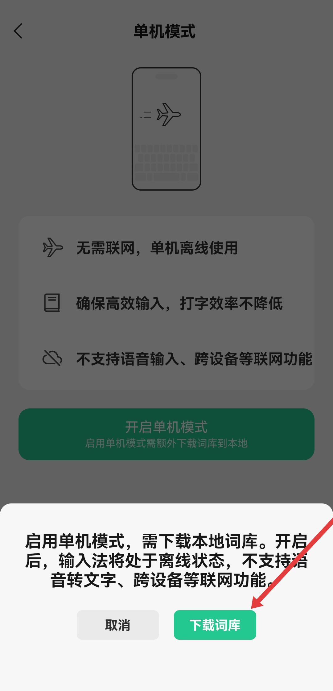 3、在提示框中,點(diǎn)擊下載詞庫(kù)按鈕,開(kāi)始下載單機(jī)模式所需的本地詞庫(kù)。