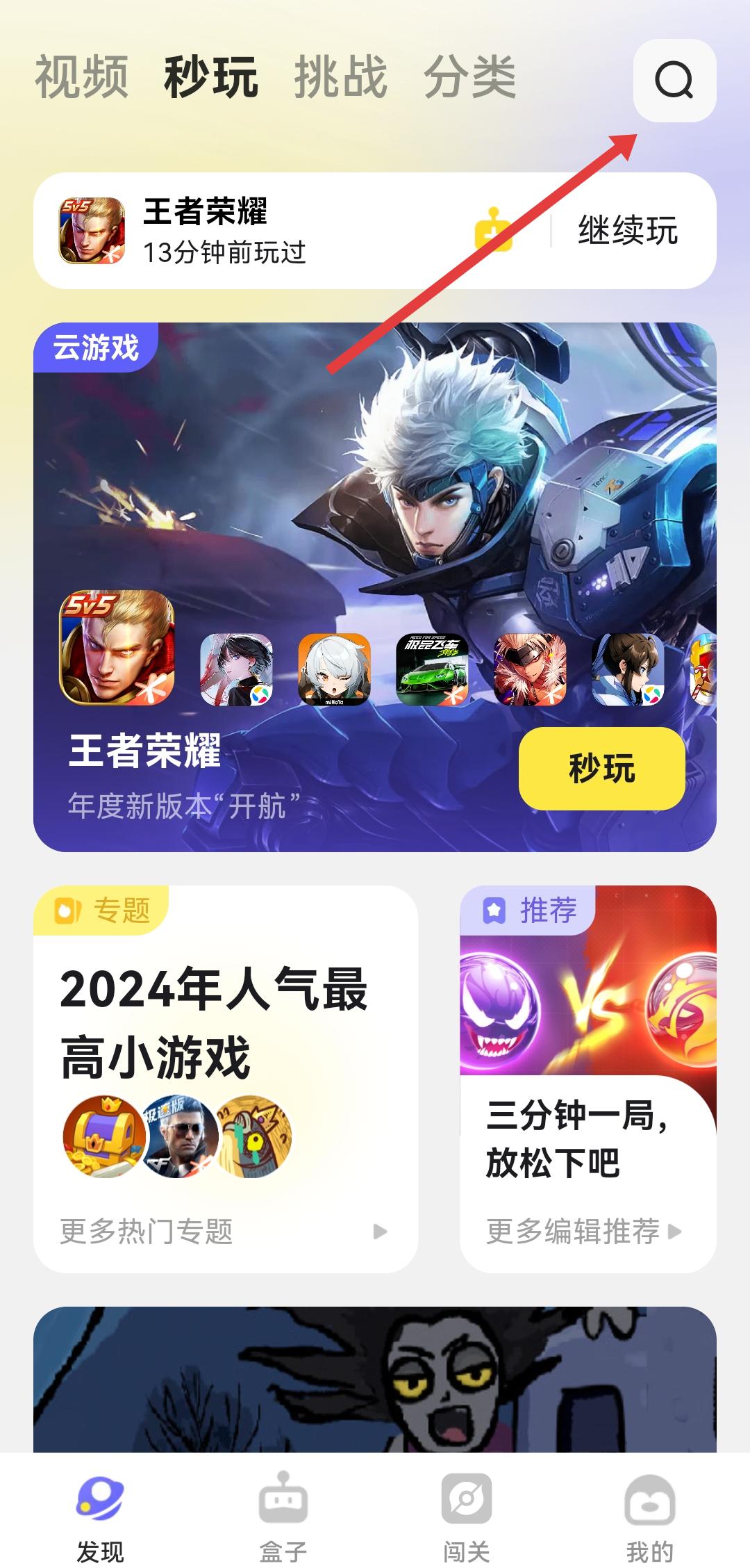 1、打開鵝盒發(fā)現(xiàn)的頁面,點擊右上角的搜索圖標(biāo),進入搜索的界面。