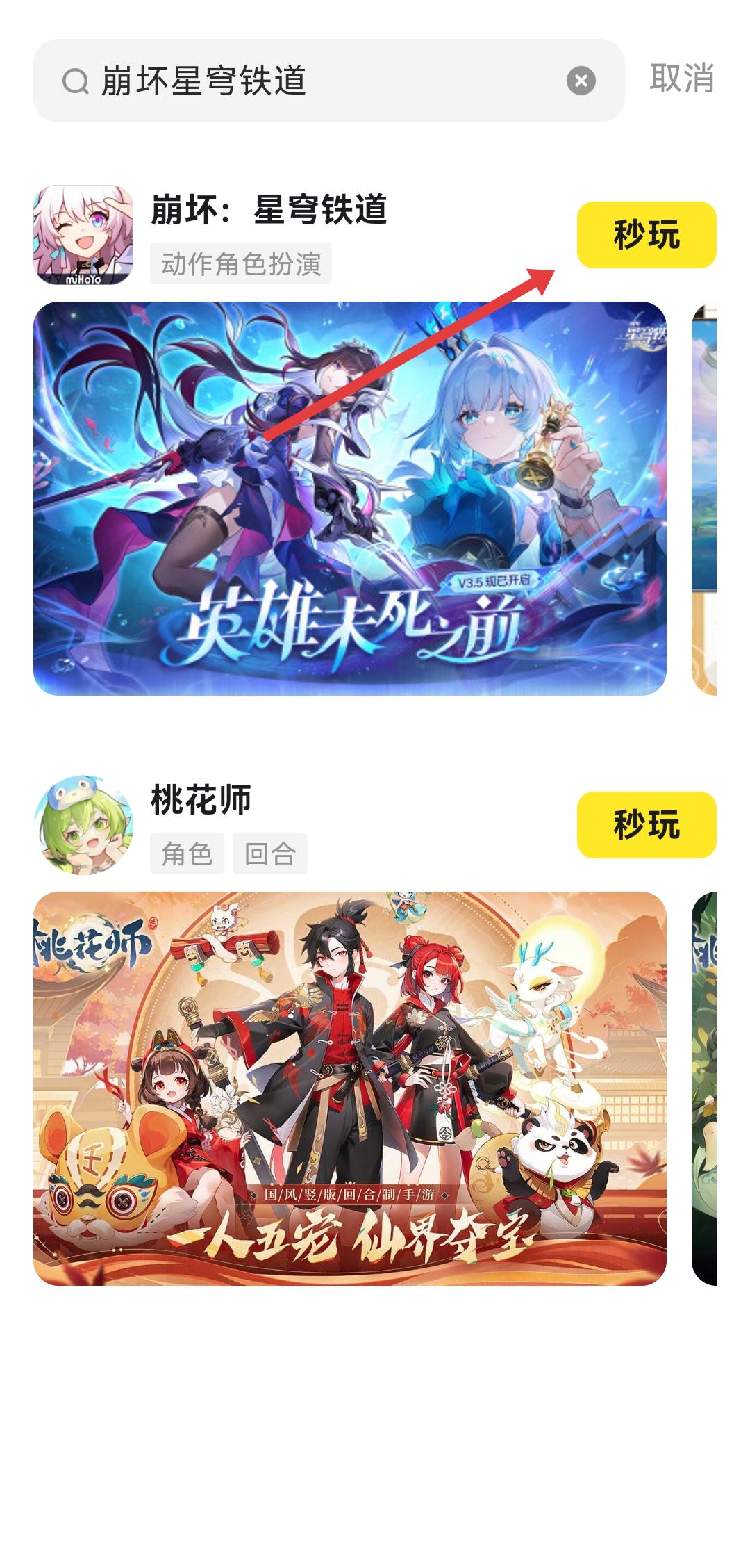 3、在搜索結(jié)果中找到崩壞星穹鐵道,點擊右側(cè)的秒玩按鈕,即可在鵝盒中游玩該游戲。