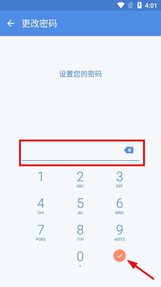 5、在設(shè)置您的密碼界面輸入新密碼,最后點(diǎn)擊下方對(duì)勾圖標(biāo)確認(rèn),即可完成密碼修改。