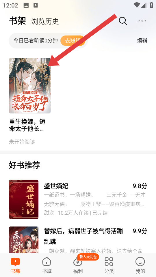 1、在七讀書架頁面,點擊要聽的小說,進(jìn)入小說閱讀界面。