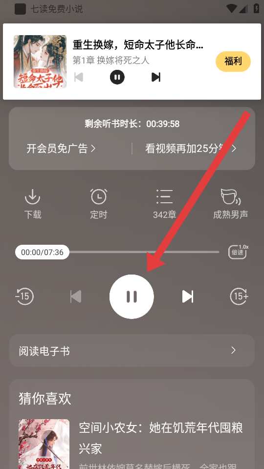 4、進(jìn)入聽書界面后,點擊中間的播放/暫停按鈕,即可控制小說音頻的播放,開始聽書。