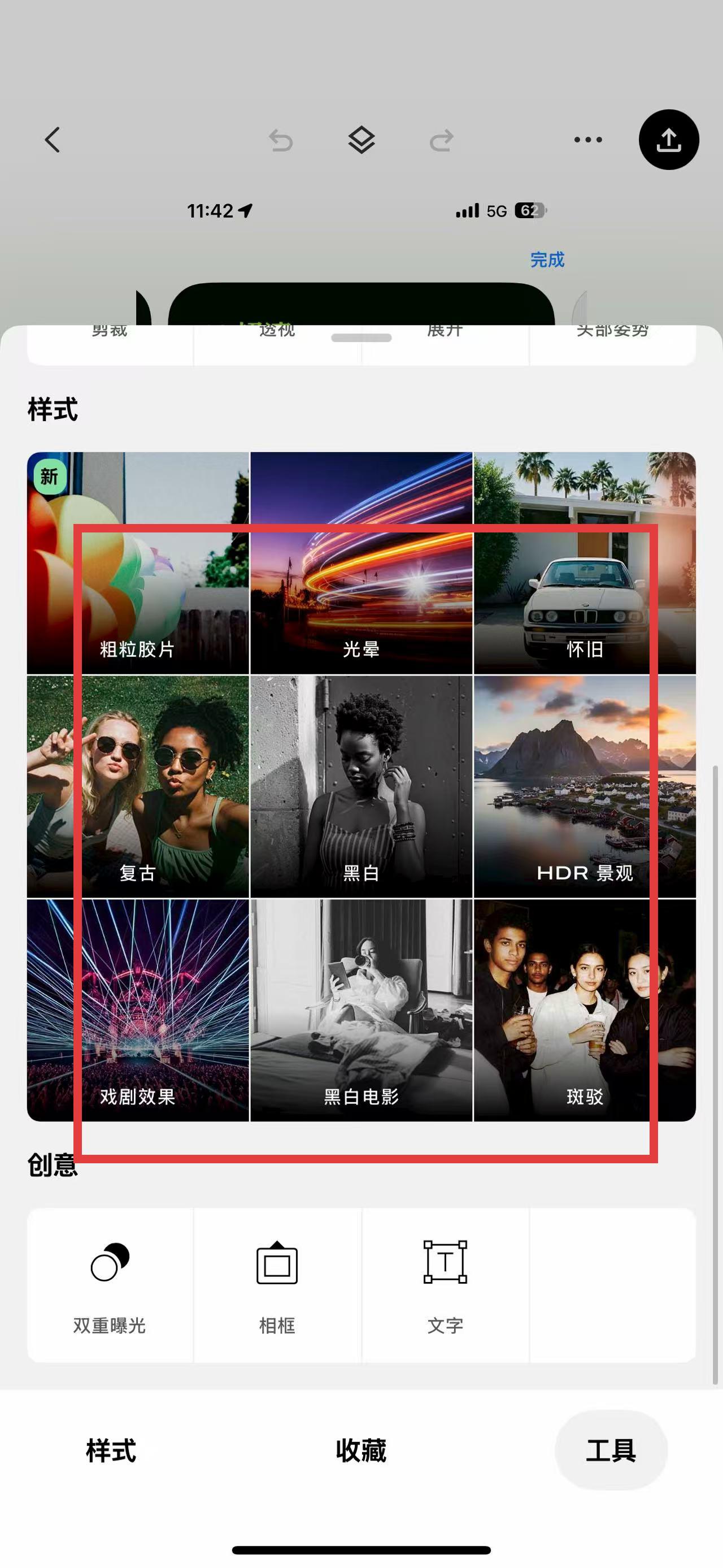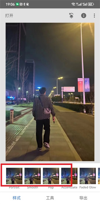 2、切換到樣式頁(yè),挑選粗粒膠片、光暈等預(yù)設(shè)風(fēng)格,一鍵賦予照片獨(dú)特氛圍,快速改變畫(huà)面格調(diào)。