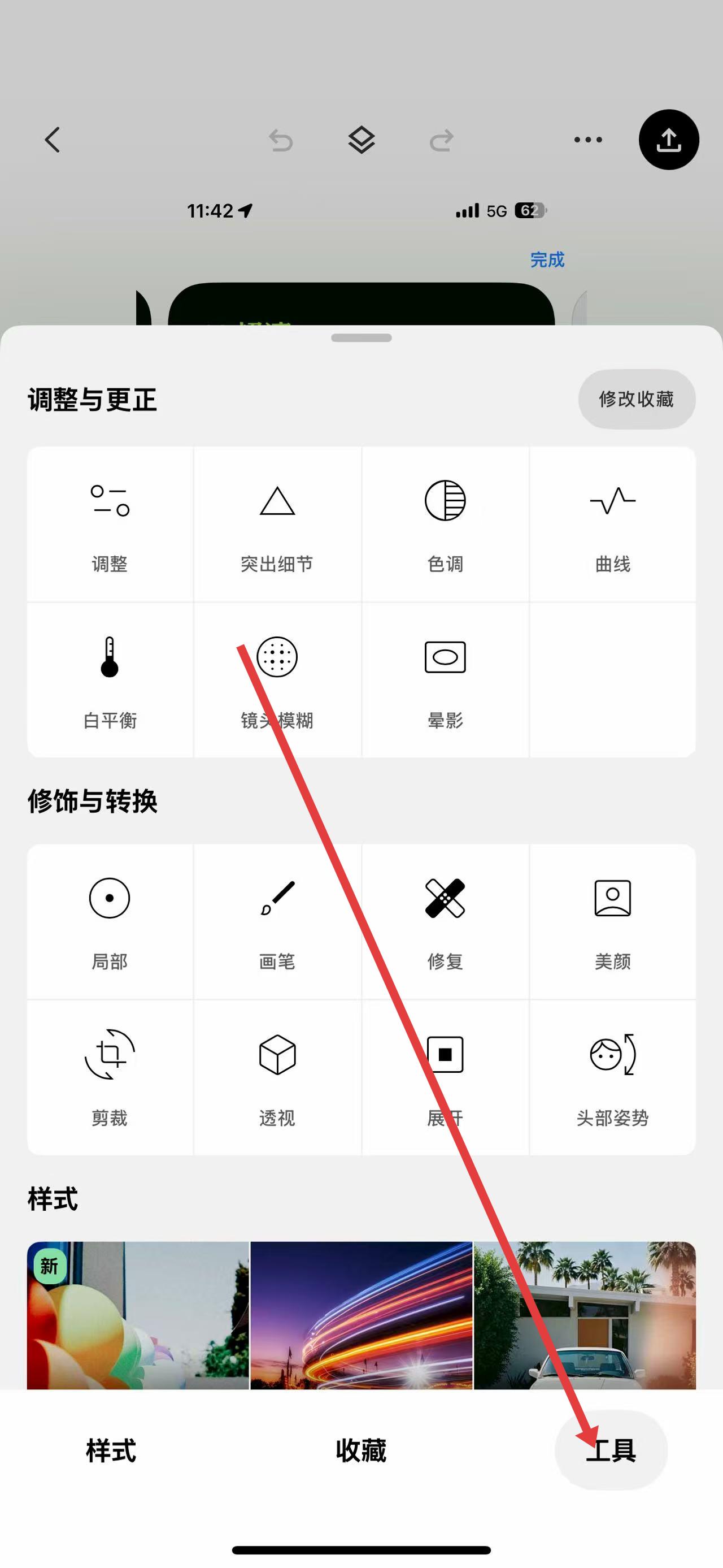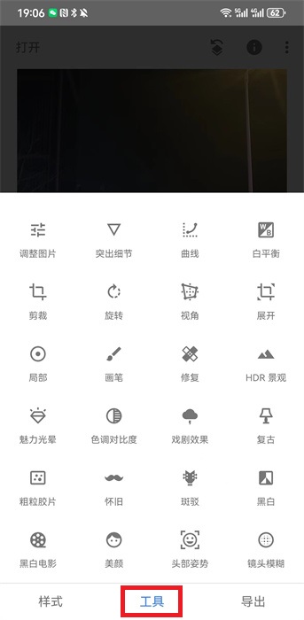 4、還可以點(diǎn)擊下方的【工具】能夠看到非常多的修圖工具;