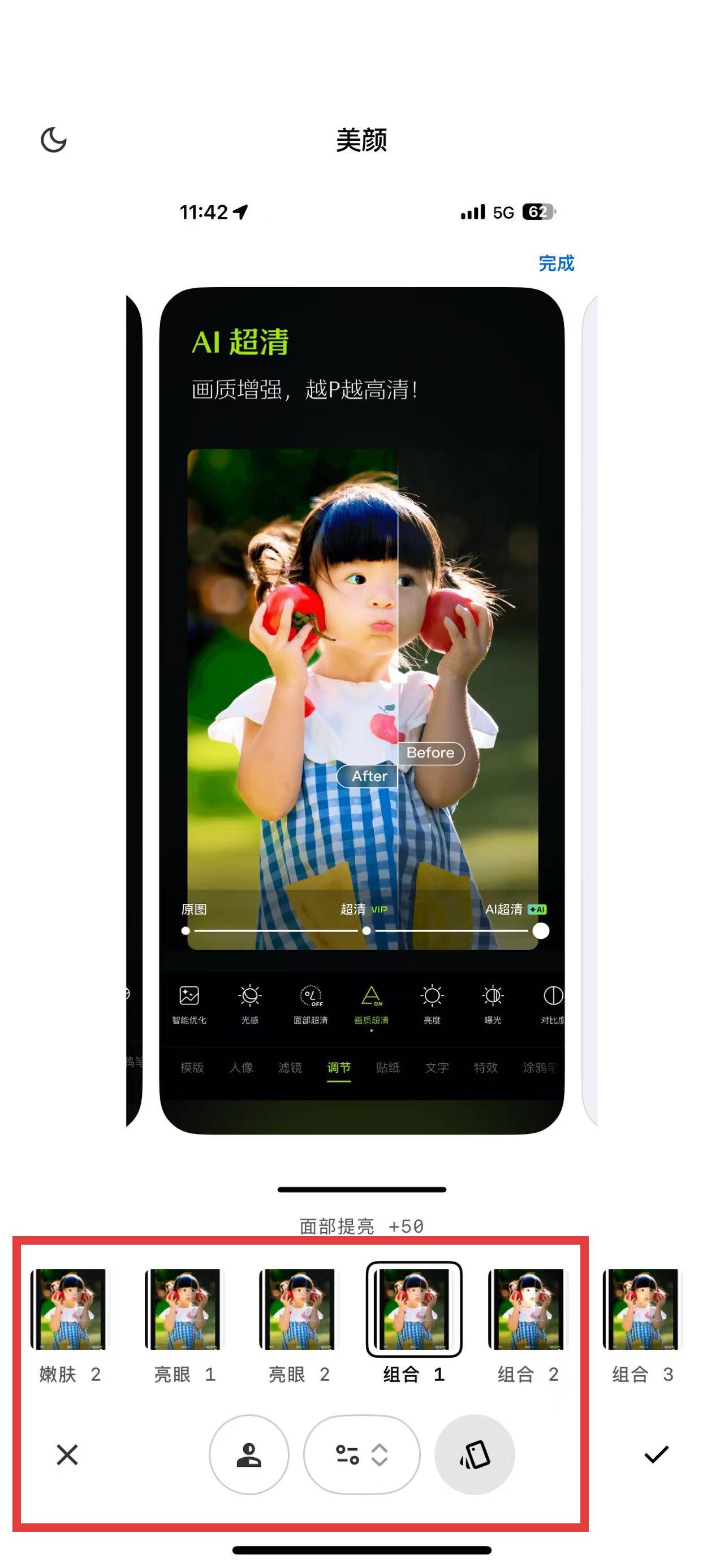 3、點(diǎn)擊美顏功能,選擇嫩膚、亮眼等組合效果,優(yōu)化人像面部細(xì)節(jié),讓人物更出彩,完成后保存作品即可。