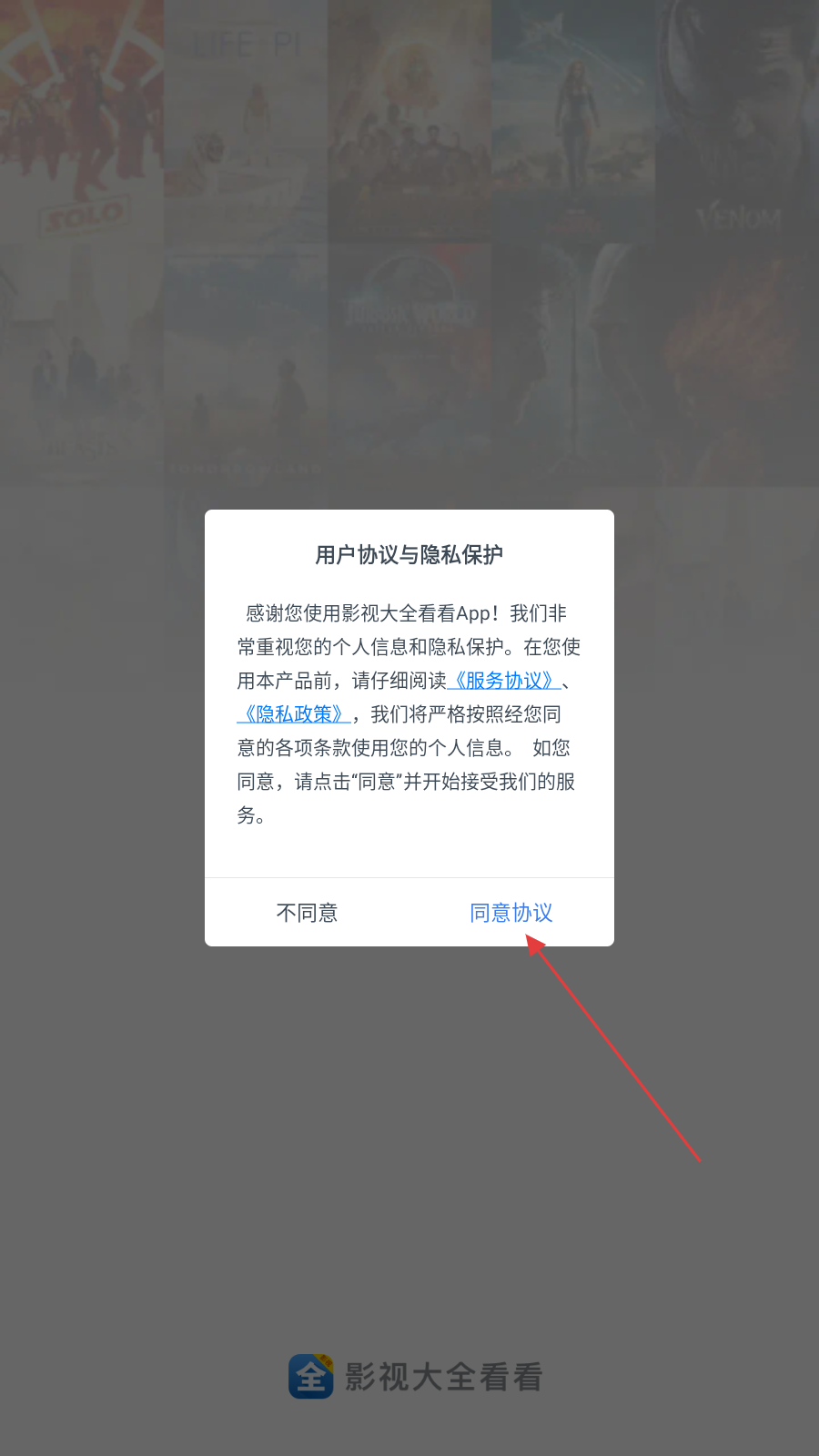 1、打開(kāi)影視大全看看APP,進(jìn)入時(shí)會(huì)彈出用戶協(xié)議與隱私保護(hù),點(diǎn)擊同意協(xié)議的按鈕。