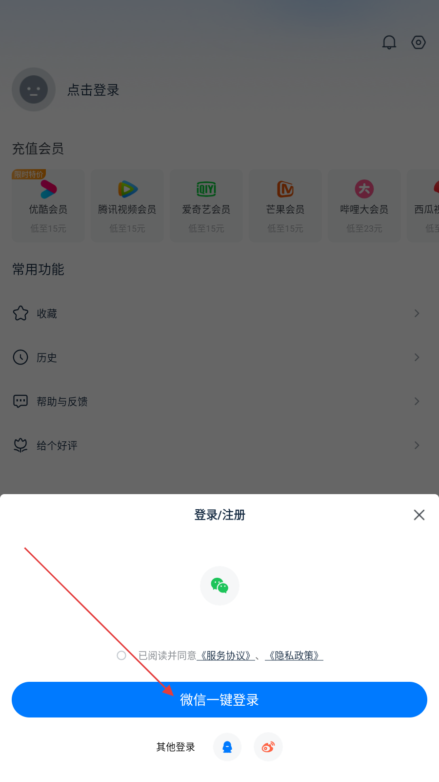 4、在下方彈出登錄/注冊(cè)的方式時(shí),點(diǎn)擊微信一鍵登錄的按鈕即可。