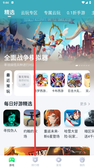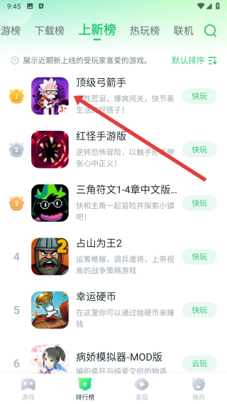1、進(jìn)入到應(yīng)用首頁后,可以點擊下方排行榜按鈕,進(jìn)入查看最新游戲。