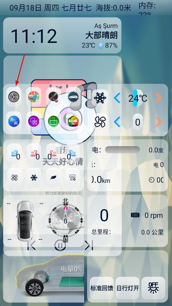 2、在APP主界面,能看到時間、天氣以及各類功能圖標(biāo)等,點擊相關(guān)設(shè)置圖標(biāo),進入設(shè)置頁面。