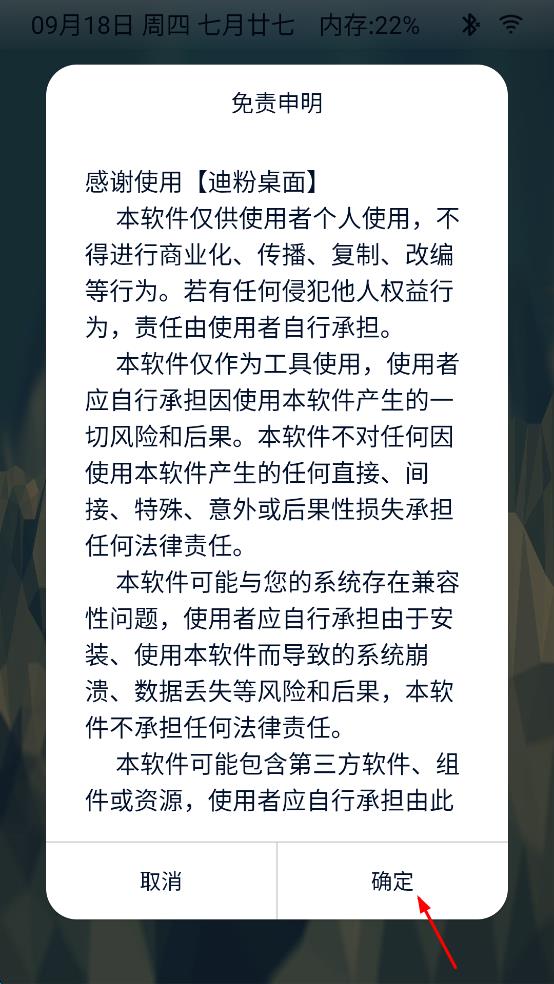 1、打開迪粉桌面APP,會彈出免責(zé)申明頁面,仔細(xì)閱讀內(nèi)容后,點擊確定按鈕,進入到APP主界面。