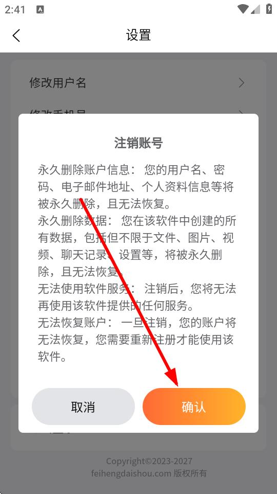 4、在彈出的注銷賬號提示框中,閱讀相關(guān)提示后,點(diǎn)擊確認(rèn)按鈕,即可注銷賬號。