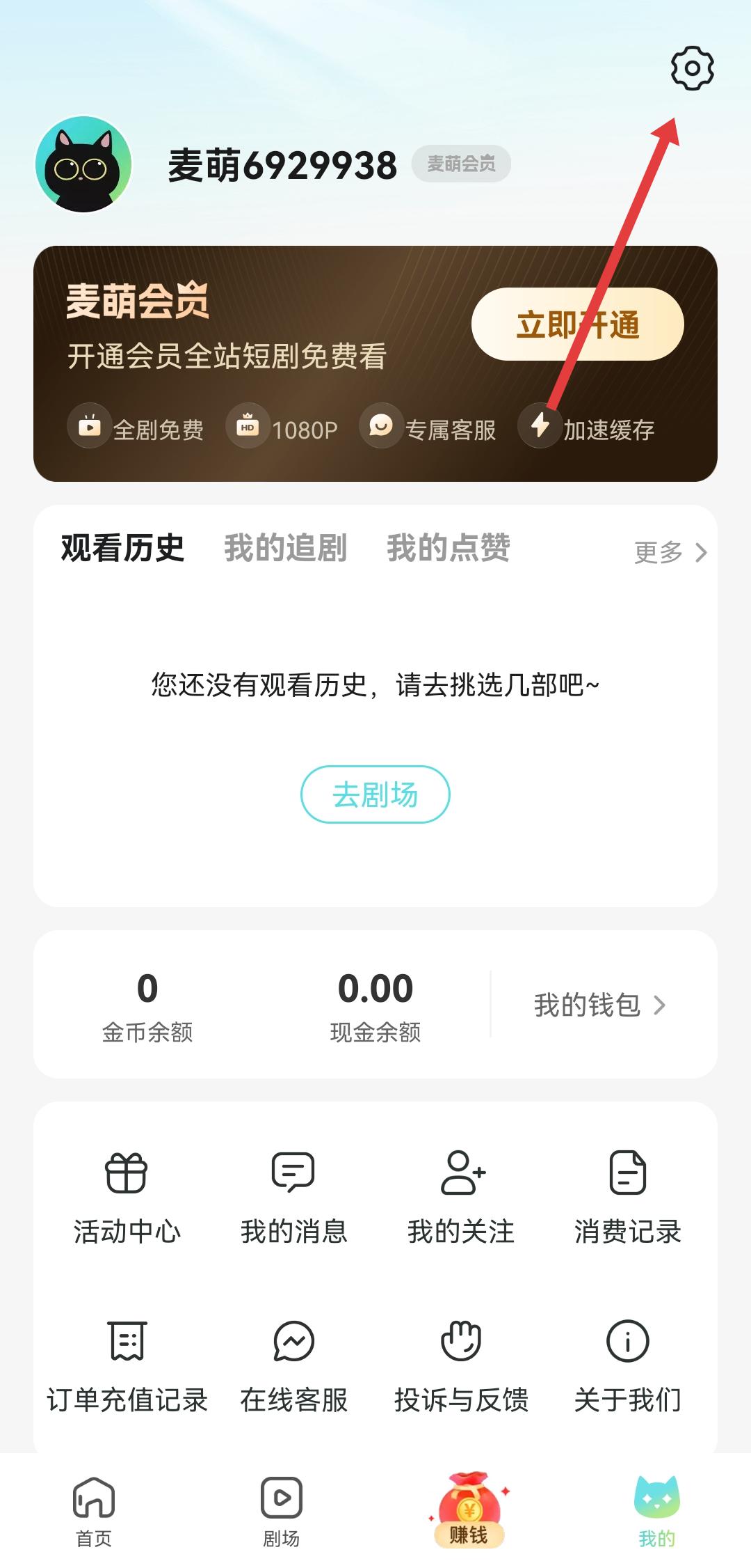 1、打開(kāi)麥萌短劇APP,進(jìn)入我的頁(yè)面,點(diǎn)擊右上角的設(shè)置圖標(biāo),進(jìn)入設(shè)置界面。