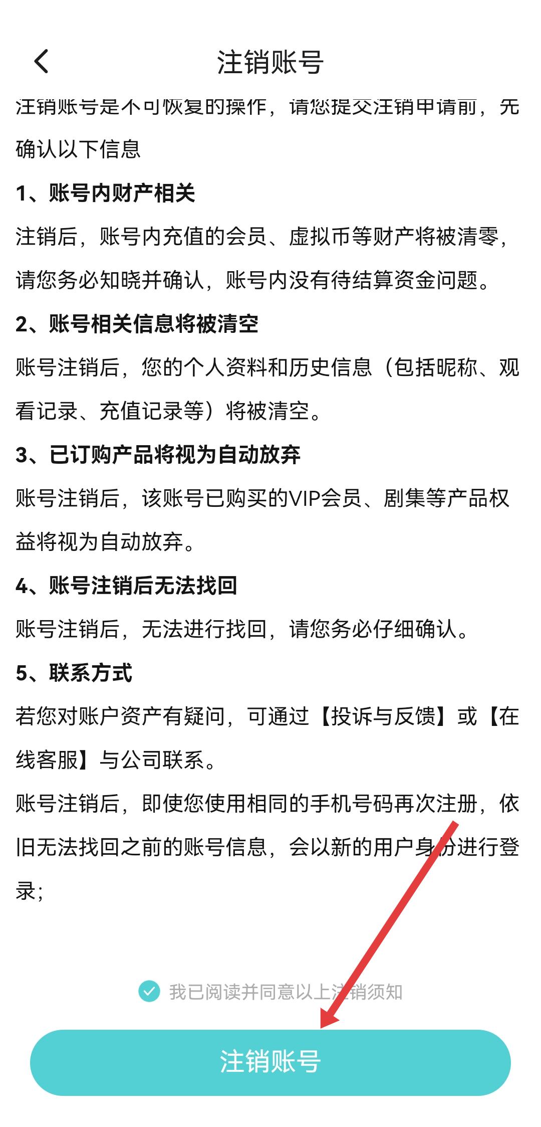 3、在注銷賬號(hào)說(shuō)明頁(yè)面,仔細(xì)閱讀注銷須知后,勾選注銷須知,然后點(diǎn)擊注銷賬號(hào)按鈕。