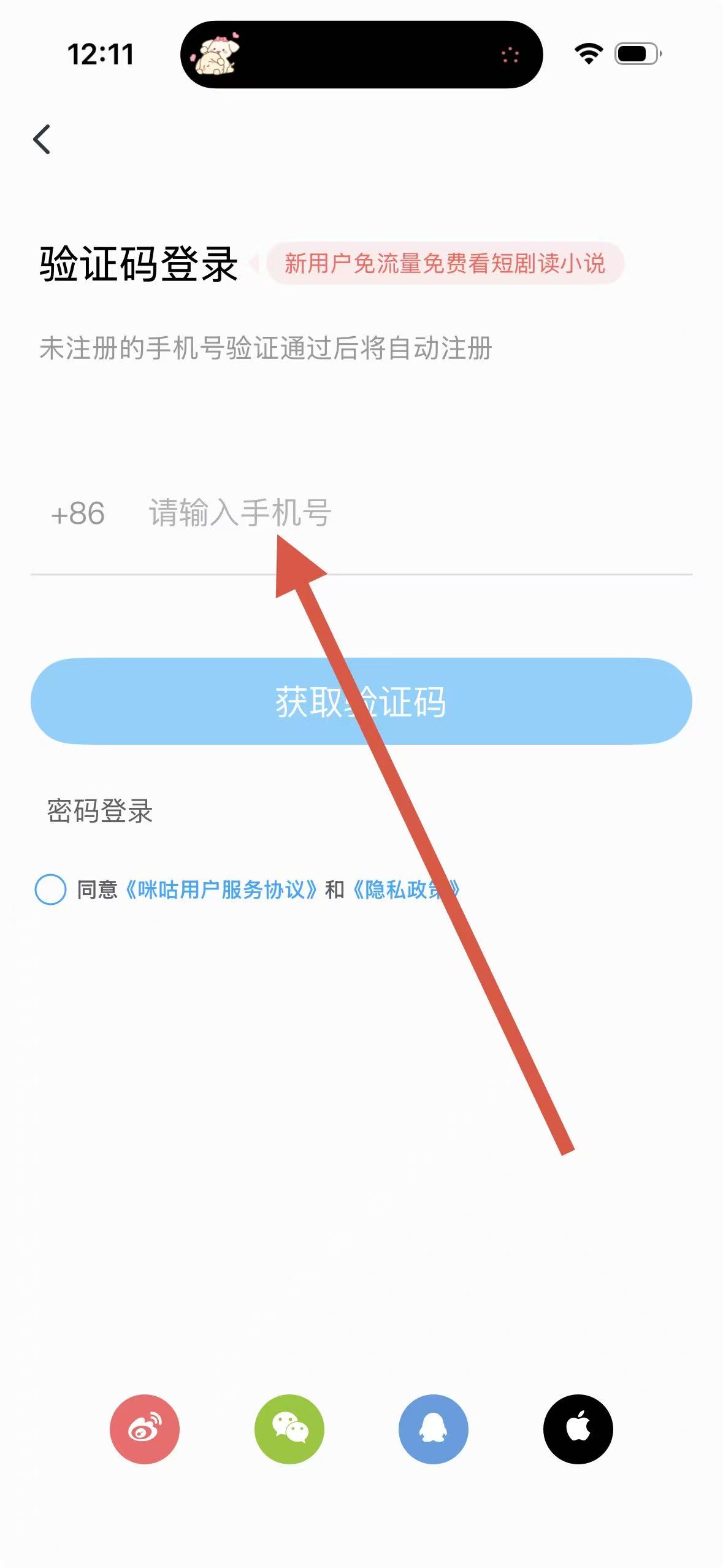 3、在登錄頁面選擇驗(yàn)證碼登錄,并在手機(jī)號輸入框中輸入手機(jī)號。
