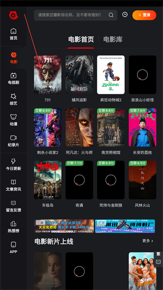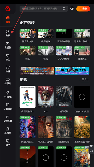 1、打開追影貓的APP,進入首頁點擊左側(cè)電影的圖標(biāo)。