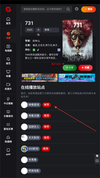 3、進入電影詳情頁面內(nèi),在播放站點下點擊即可開始看。