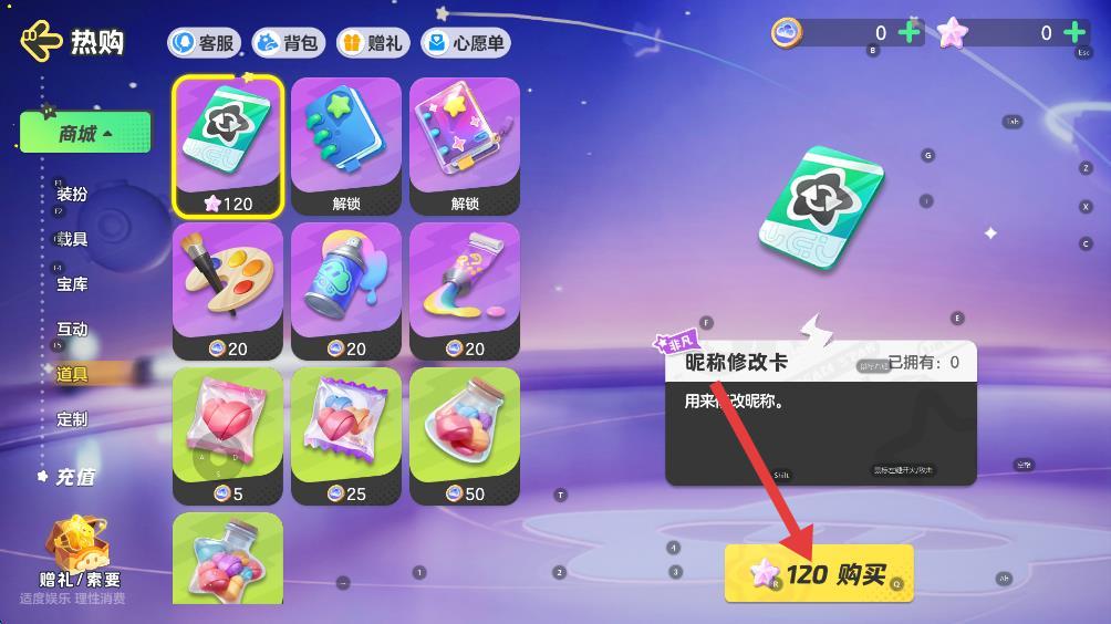 1、改名需要消耗一張改名卡,在商城中花費(fèi)120個(gè)星星購(gòu)買(mǎi)改名卡。