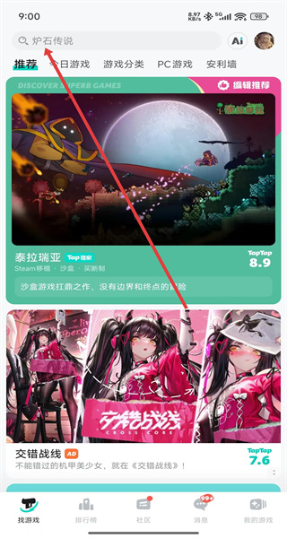 1、在進入到應(yīng)用首頁中,可以點擊頂部搜索欄進行搜索感興趣的游戲。