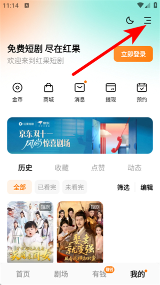 1、在紅果短劇我的頁面,點(diǎn)擊右上角三條橫線圖標(biāo),彈出功能菜單。