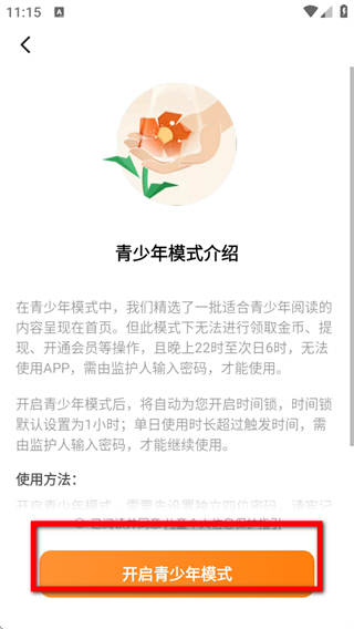 4、在青少年模式介紹界面,點(diǎn)擊開啟青少年模式按鈕,即可開啟該模式。